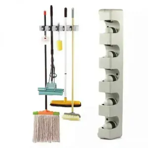 حامل المكانس يريحك من فوضى المكانس وأدوات التنضيف، يمسك العصى بقبضتين وتكون كل المكانس باتجاه واحد للأسفل بمنظر جد مرتب ومريح لا تشغل حيز ومساحة كبيرة على العكس توفر أكبر مساحة ممكنة..يمكن تثبيتها على الحائط أو على باب الخزانه.تحتوي على خمس فتحات تستوعب عدد كبير من الأغراض: كما يوجد بها 6 علاقات لمختلف الأدوات .. قدم طلبك فورا …